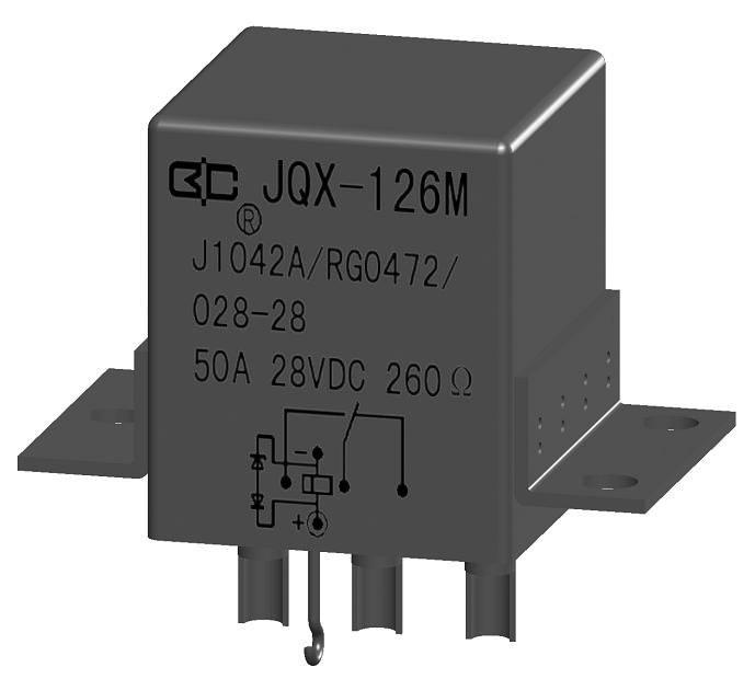 - JQX-126M型小型强功率密封直流电磁继电器体积小,负载大,线圈带瞬态抑制,环境适应性强,主要用于航天、航空及其它电子设备中